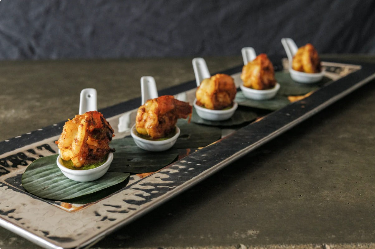 Elegant, bite-sized favourites like mini samosas, gunpowder prawns, sliders, & biryani boxes, perfect for cocktail hours or receptions.